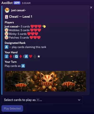 Section titled “How It Works”Start a game with /cheat start. You’ll be seated at a table with 3 AI opponents, each with their own personality and play style.